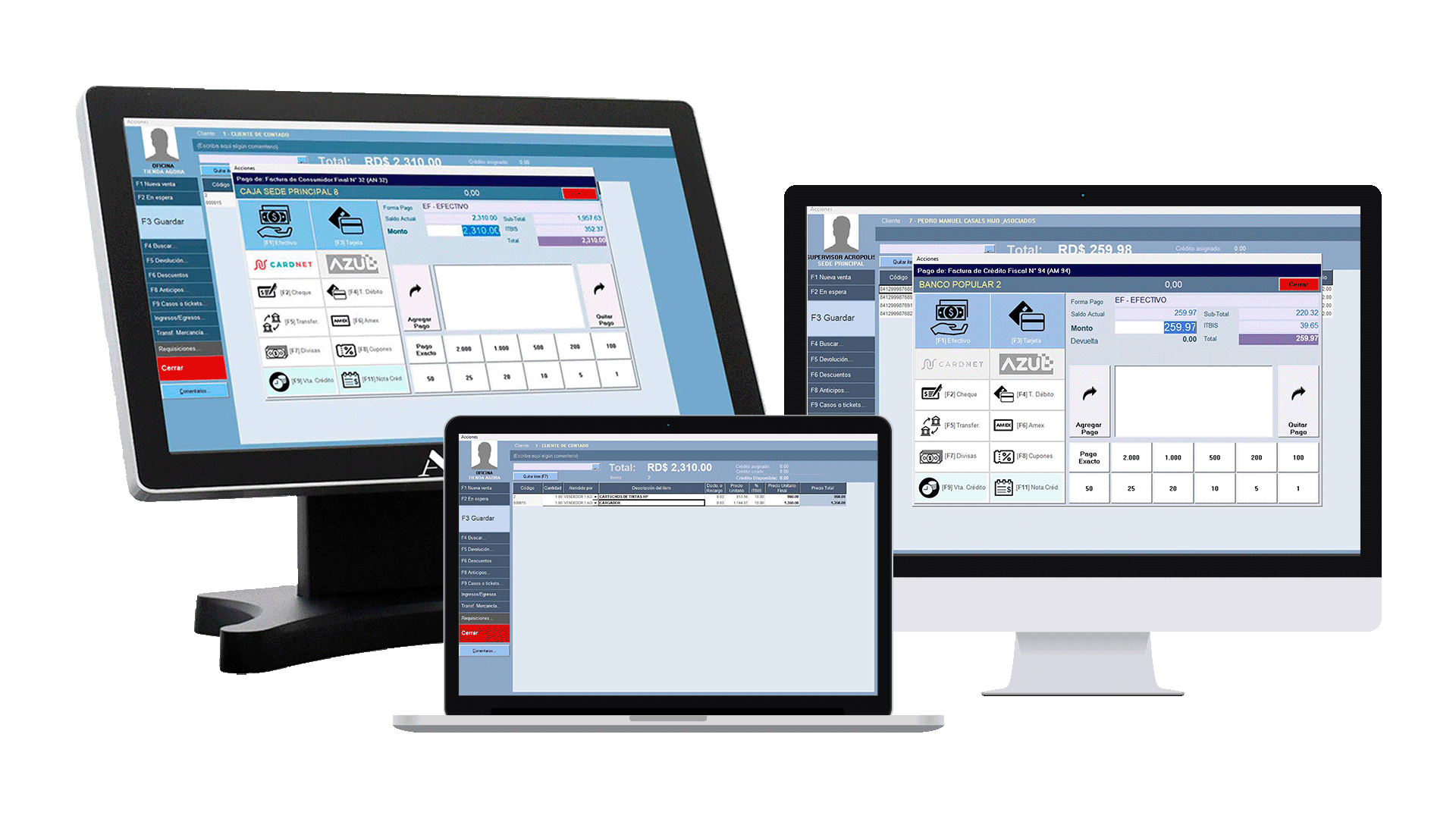 - Integración con paneles de cobro con tarjetas, lectores de código de barra/QR, cajones de dinero, visores de precios, impresoras fiscales y facturación electrónica